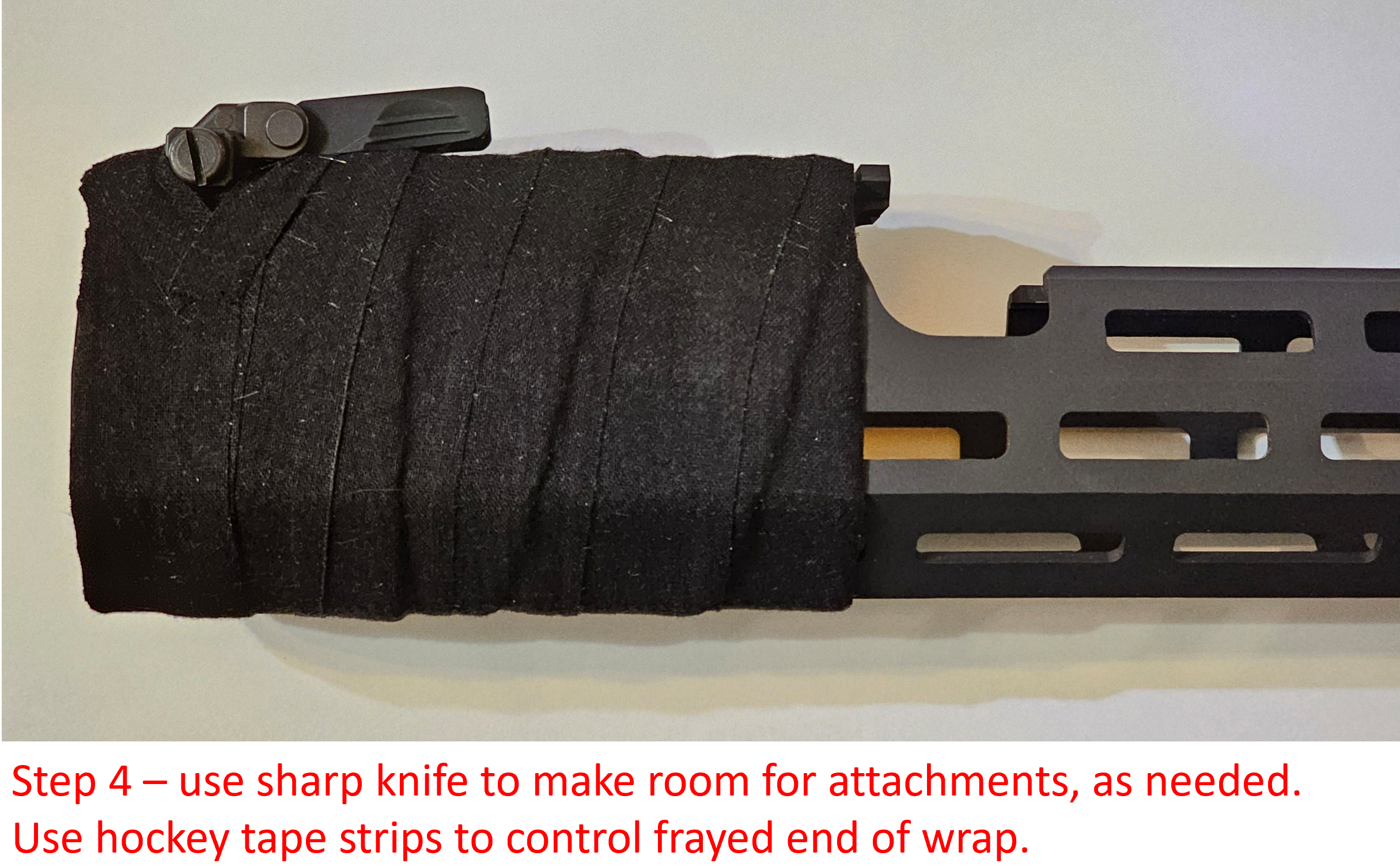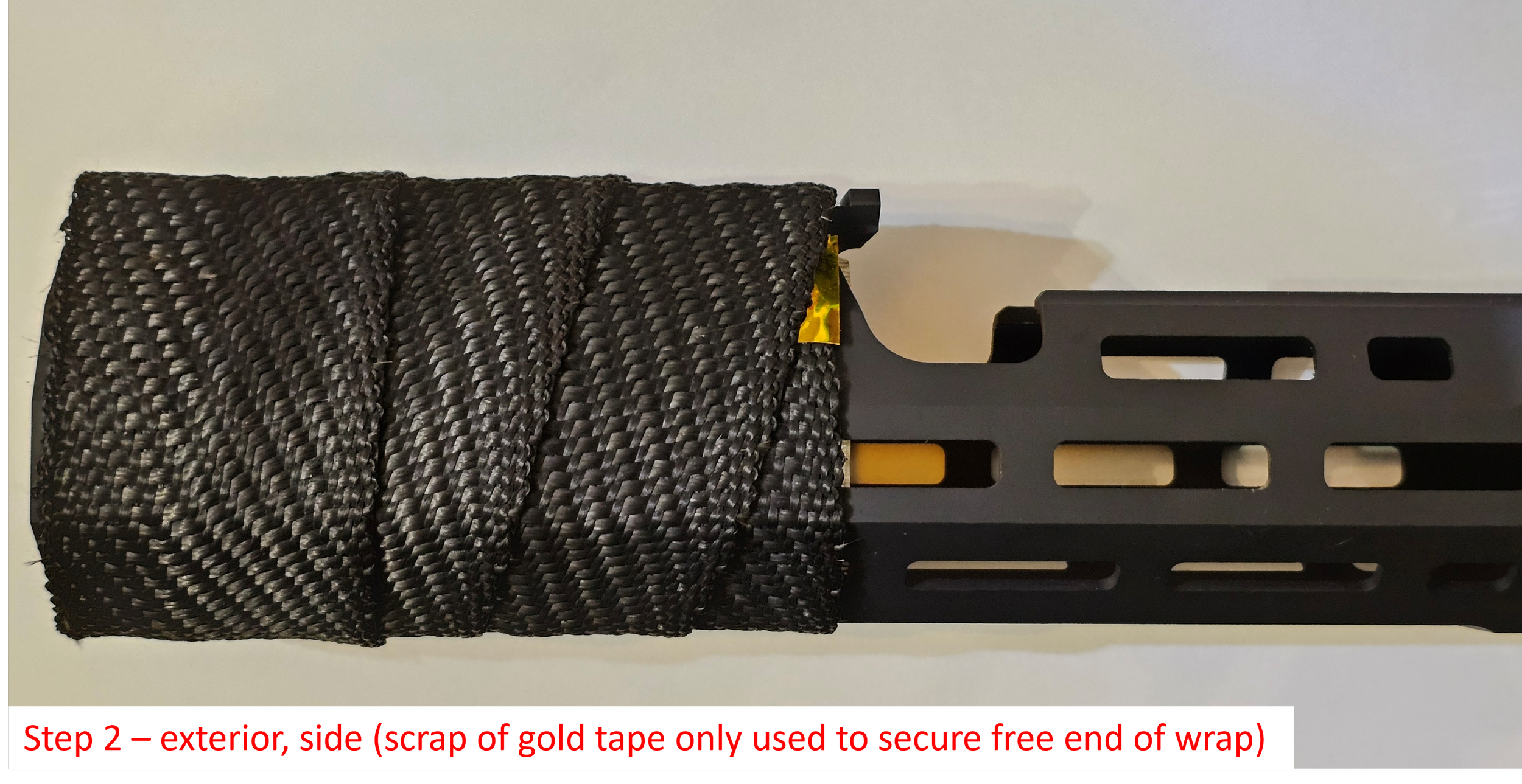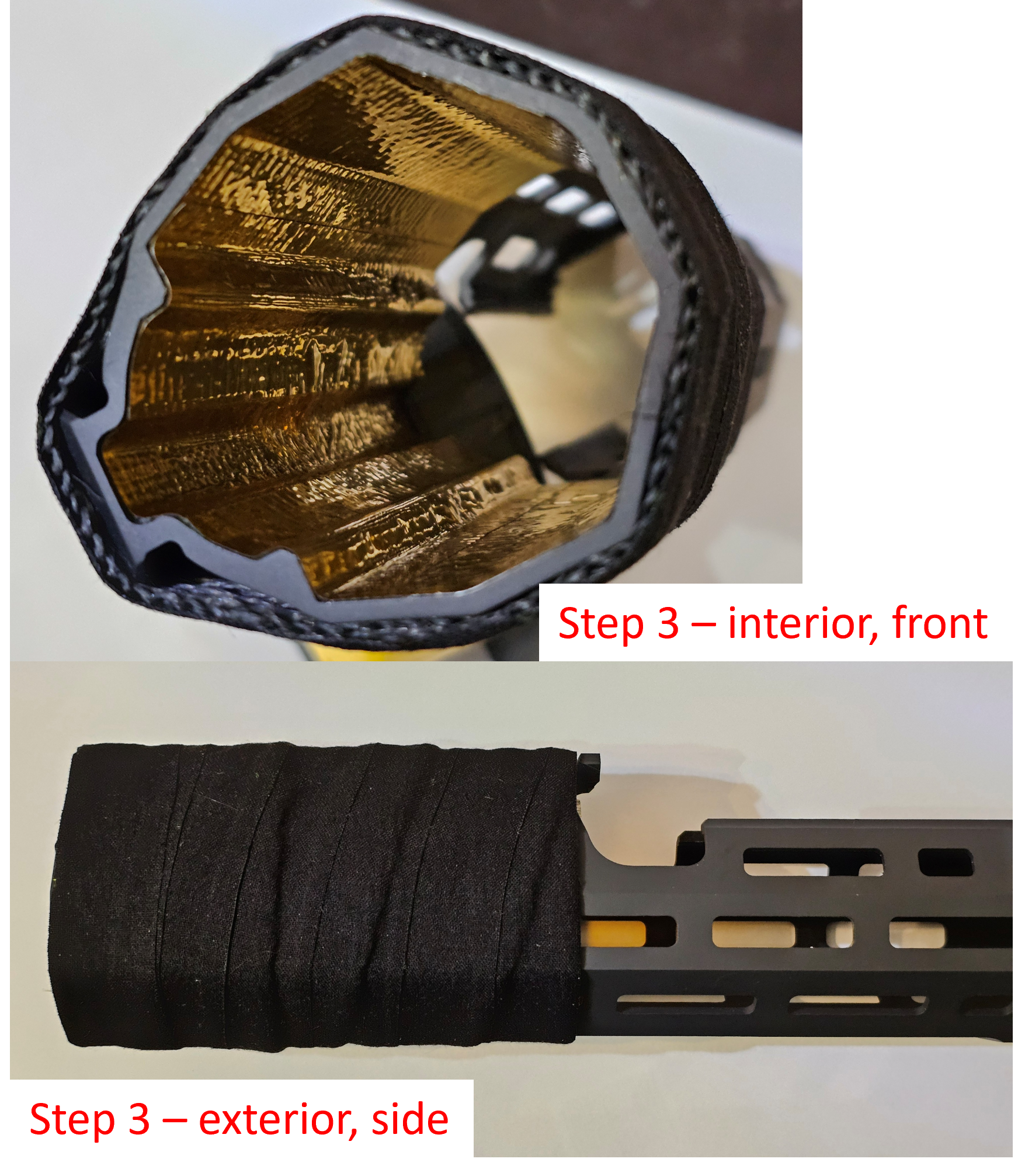 Only one layer of basalt wrap is shown installed, above. Current field trials indicate two wrap layers may be prudent, depending on firing schedule. The above configuration may allow the user to fire up to three 30-round magazines of supersonic 300 BLK ammunition without gloves before the heat becomes intolerable.
